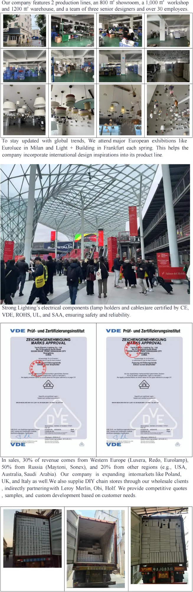 Zhongshan को Guzhen टाउन लाइटिङ हबमा जरा गाडिएको, Strong Lighting ले मिलान Euroluce र Frankfurt Light + Building प्रदर्शनीहरूमा विश्वव्यापी प्रचलनहरूबाट प्रेरणा लिन्छ, जसले हाम्रा डिजाइनहरू उद्योग घुम्तीहरू भन्दा अगाडि रहन सुनिश्चित गर्दछ। हाम्रो 1,000㎡ कार्यशाला र दोहोरो उत्पादन लाइनहरूले 100 x 40HQ कन्टेनरहरूको वार्षिक आउटपुट समर्थन गर्दछ, जसले हामीलाई निरन्तर गुणस्तरका साथ ठूलो मात्रामा थोक आदेशहरू ह्यान्डल गर्न सक्षम बनाउँछ।