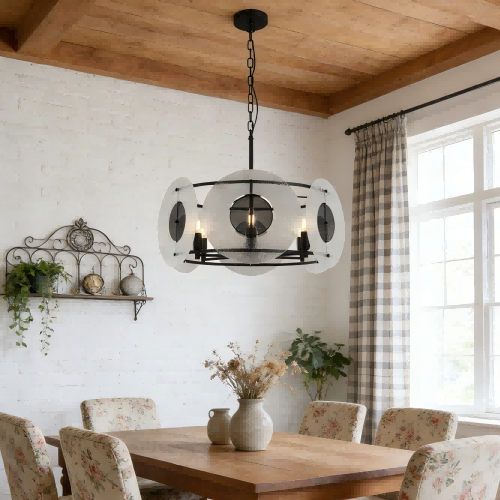 बलियो म्याट कालो फलामको फ्रेमसँग निर्मित, यो म्याट कालो गिलास झूमरले गोलाकार सुगर गिलास शेडहरू र हनीकोम्ब धातुको जालको सुविधा दिन्छ, जसले एक आकर्षक स्तरित सौन्दर्य सिर्जना गर्दछ जहाँ प्रकाश टेक्सचर्ड गिलासबाट नरम रूपमा फैलिन्छ जबकि जालले औद्योगिक किनारा थप्छ।